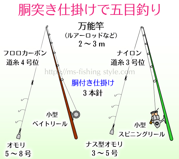 主に胴突(どうつき)仕掛けを使って、魚種多彩に色んな魚を手軽に釣る方法です。