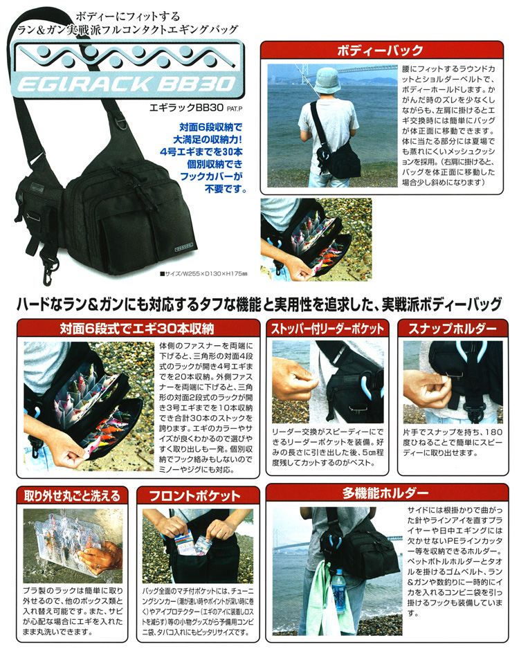 エギングを始めて最初に買ったエギング専用の鞄です。利便性や快適性もありますが、収納本数が思ったより少ない… プラスチックケースは良いアイデアで、ミノープラグなども針のまま入れて使ってましたが、エギング以外の釣りもするには収納量がやっぱり足りませんでした。 当時はなかなか手に入らないパイオニア的な良い鞄でした。