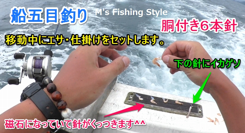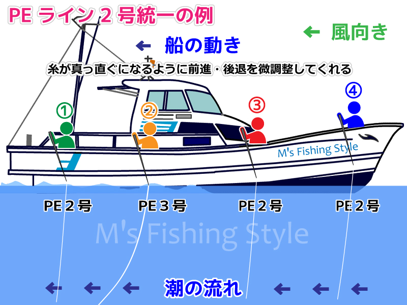 船は、基本的にトモ(後ろ側)からポイントに入っていきます。ですので、仕掛けの細い人が前側(ミヨシ)、太い人が船尾(トモ・後ろ側)に移動します。