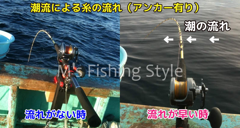 アンカー(錨・いかり)を打つ釣りの場合は、特に顕著に出ます。※細い糸でも同様の事が起きます。