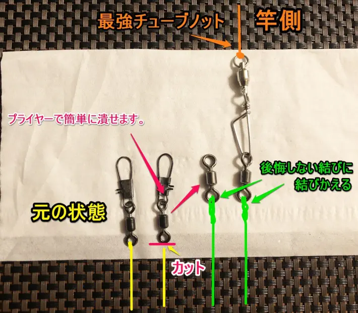 また、仕掛け側の結びを強力な結びで結び変えてます。(簡単に切れた経験から)