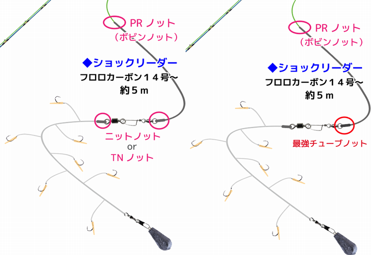 サワラ・マグロなどの牙物狙いの場合は、ナイロンリーダーの先に太いフロロカーボンの糸(50cm程度)を電車結びで付ける場合もあります。