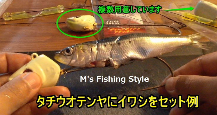 タチウオ釣りでは、テンヤという物にイワシをくくりつけて狙います。