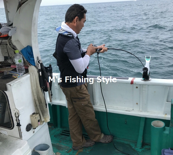 竿が突っ込むアタリが来て、すぐに両手で竿とリールを支えて、電動で巻き上げています。