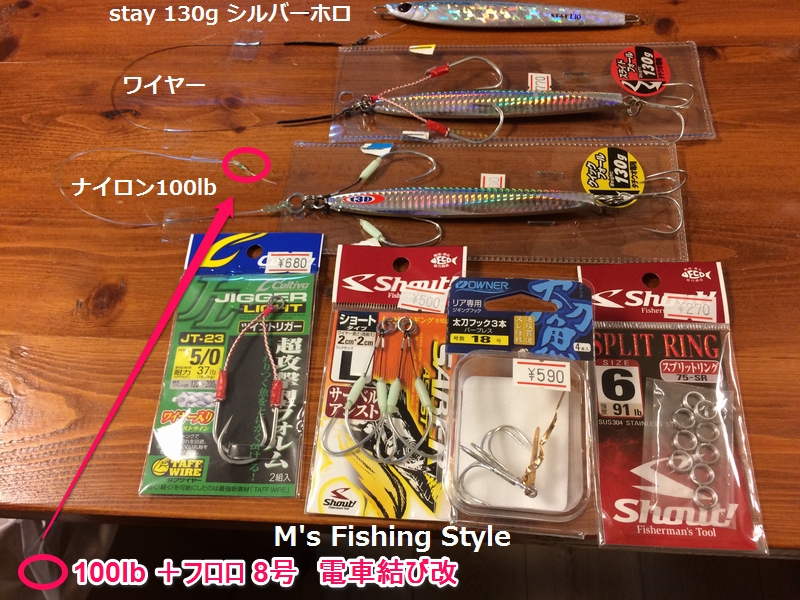 僕はシングルフックが好き(絡まってる時間が勿体無い^^;)なので、ロングジグには上に一つ、STAY(ステイ)には上下にグランドパイク(5/0)を付けてます。